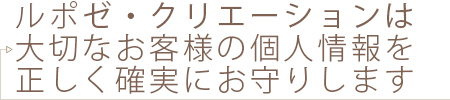 有限会社ルポゼ・クリエーション(以下、弊社と表記します)では、お客様の個人情報漏洩を未然に防ぎ、適切に取扱うべく、個人情報保護に関する法令を尊び、弊社としてのプライバシーポリシーを定めております。